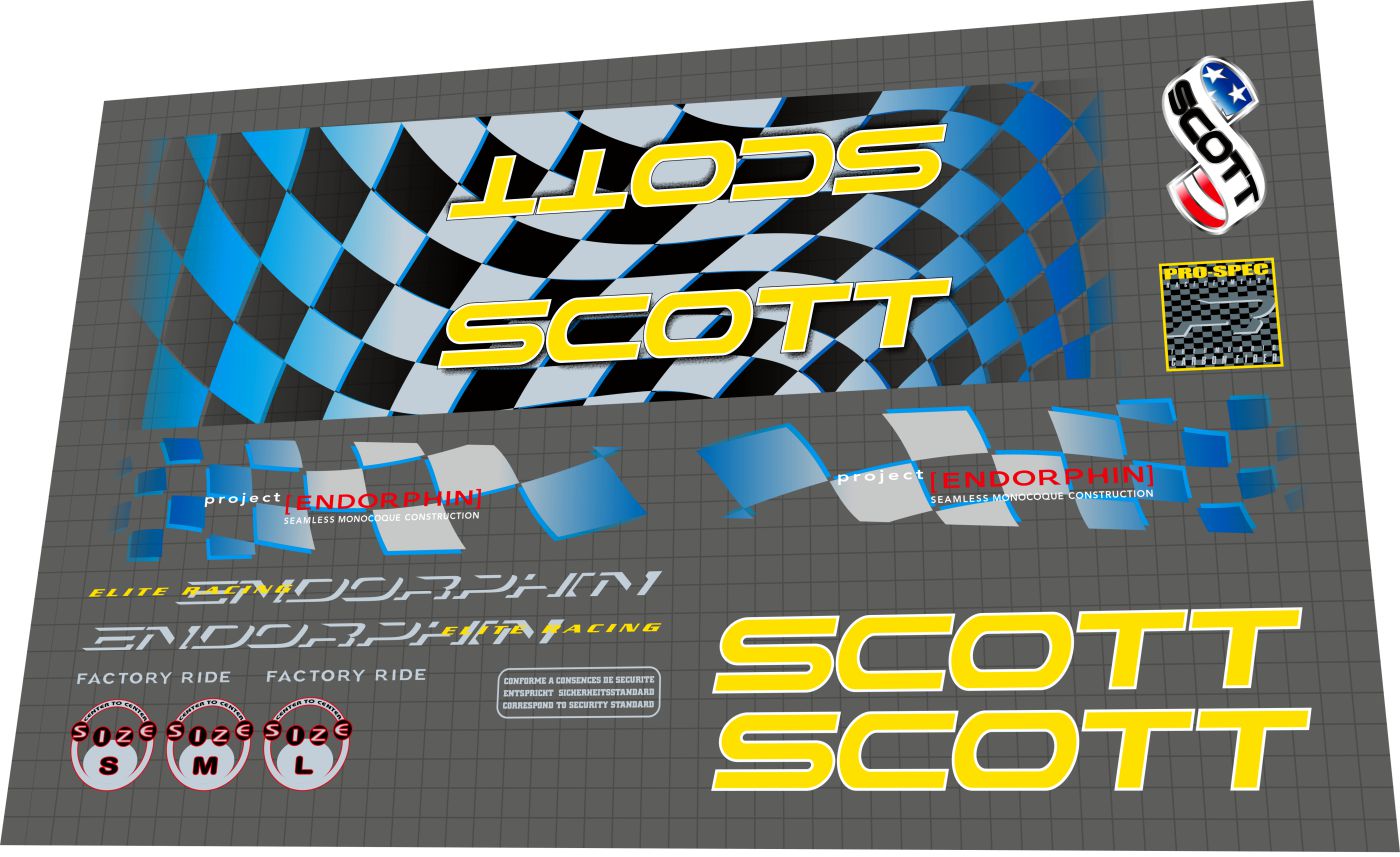The Endorphin Elite Racing is a legitimate piece of 90s MTB history — carbon monocoque when the rest of the industry was still figuring out aluminum. These decals are faithful to the original blue, yellow, and white chequered colorway, proportions, and placement so your restoration is worthy of the frame it goes on.