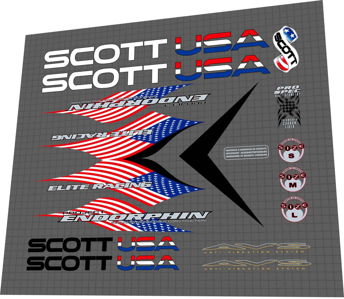 Down tube Scott USA logos (x2), American flag wave panel decals (x2), Elite Racing tube decals (x2), Project Endorphin Seamless Monocoque Construction panel decal, Scott USA head badge, Pro-Spec Race Geometry / Thermobrid Carbon Fiber badge, AVS Anti-Vibration System chainstay decals (x2), size badges (S, M, L), and security standard compliance badge.