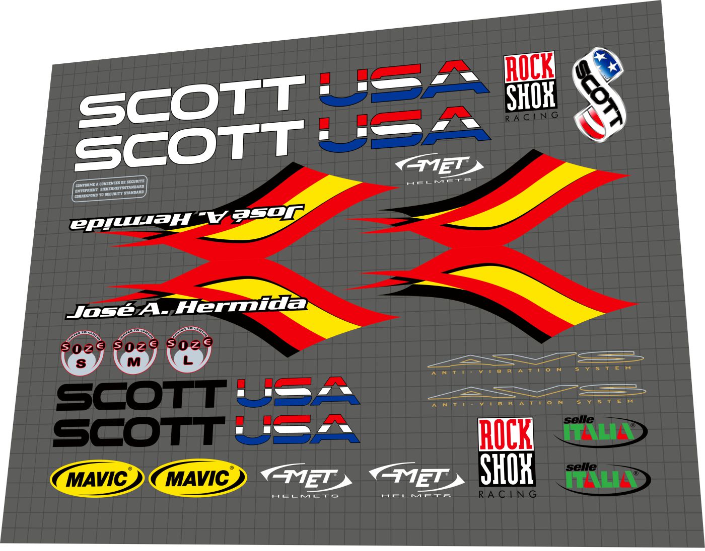 Down tube Scott USA logos (x2), Spanish flag wave panel decals (x2), José A. Hermida signature tube decals (x2), Scott USA head badge, AVS Anti-Vibration System chainstay decals (x2), RockShox Racing fork badges (x2), MET Helmets sponsor badges (x2), Mavic wheel sponsor badges (x2), Selle Italia saddle sponsor badges (x2), size badges (S, M, L), and security standard compliance badge.